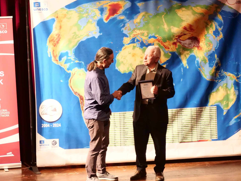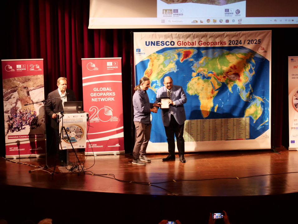 Κατά τη διάρκεια της εκδήλωσης πραγματοποιήθηκε απονομή τιμητικής πλακέτας από τον Πρόεδρο του Μουσείου Φυσικής Ιστορίας Απολιθωμένου Δάσους Λέσβου Καθ. Ν. Σουλακέλλη, στον Περιφερειάρχη Β. Αιγαίου κ. Κ. Μουτζούρη, στο Δήμαρχο Μυτιλήνης κ. Π. Χριστόφα και το Δήμαρχο Δυτικής Λέσβου κ. Τ. Βέρρο για τη συνεργασία και υποστήριξη των δράσεων του Μουσείου Φυσικής Ιστορίας Απολιθωμένου Δάσους Λέσβου στα πλαίσια της αναγνώρισης της Λέσβου ως Παγκόσμιο Γεωπάρκο UNESCO και την οργάνωση του Σχολείου Γεωπάρκων.