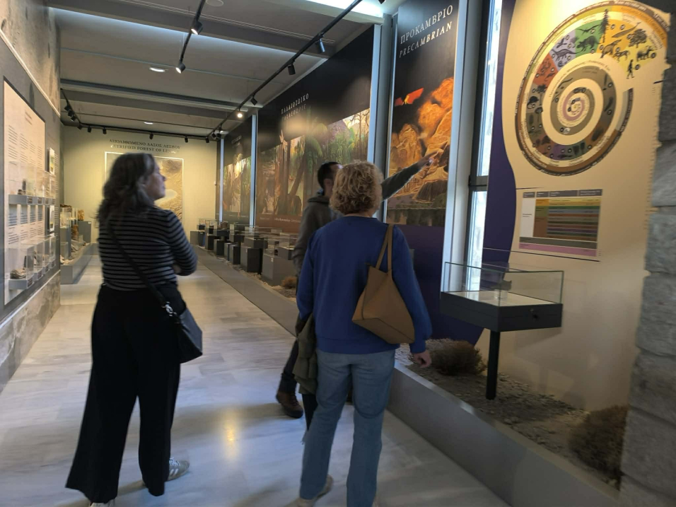 Στη συνέχεια περιηγήθηκαν στους μόνιμους εκθεσιακούς χώρους του Μουσείου, όπου μέσα από τις μακέτες και τα εκθέματά του γνώρισαν την εξέλιξη της ζωής στο πέρασμα του γεωλογικού χρόνου ενώ ιδιαίτερα αναφορά έγινε για τα ευρήματα του Απολιθωμένου Δάσους και τη σημασία τους στην κατανόηση της γεωλογικής ιστορίας και εξέλιξης του Αιγαίου και της Λέσβου. Ακολούθησε ενημέρωσή τους για τα γεωλογικά φαινόμενα που σχετίζονται με τη δημιουργία του Απολιθωμένου Δάσους Λέσβου, γνώρισαν τις μακέτες, το χαρτογραφικό υλικό και τα μοναδικά εκθέματα ορυκτών και πετρωμάτων που μπορούν να αξιοποιηθούν στα πλαίσιο εκπαιδευτικών προγραμμάτων μαθητών.