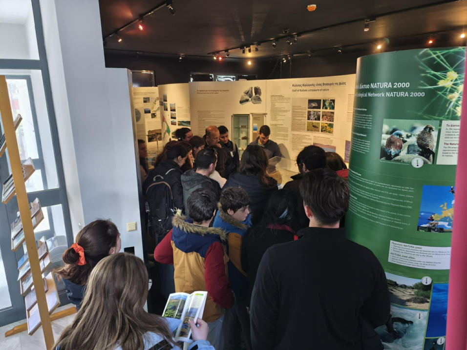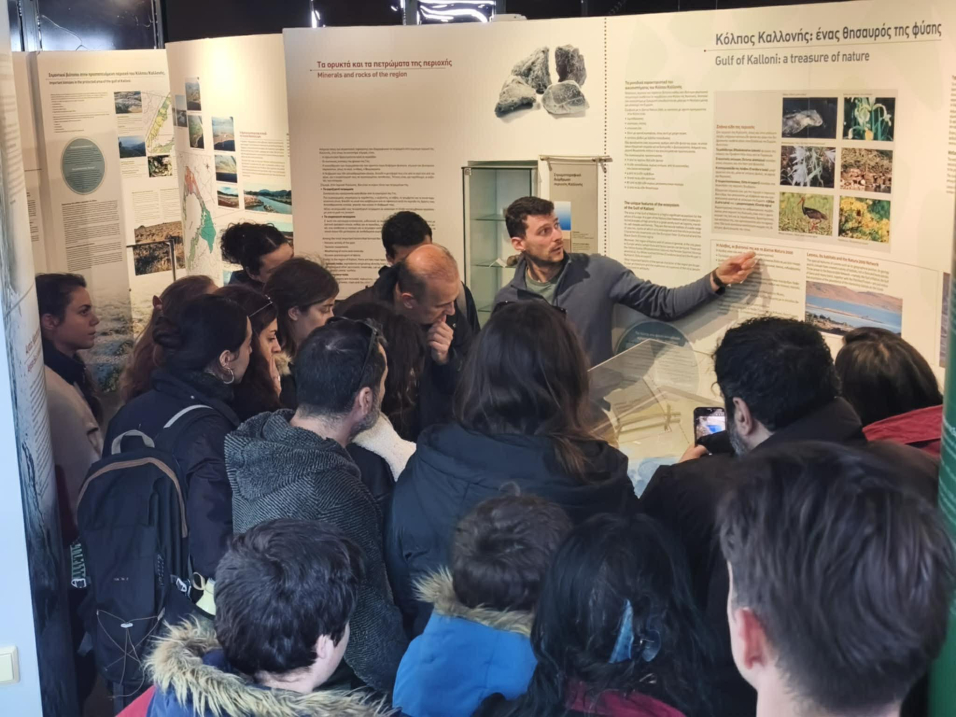 Στη συνέχεια, οι φοιτητές επισκέφθηκαν το Κέντρο Περιβαλλοντικής Ενημέρωσης Καλλονής, όπου πραγματοποιήθηκε παρουσίαση σχετικά με τα φυσικά χαρακτηριστικά της περιοχής, τη σημασία των προστατευόμενων οικοσυστημάτων και τις δράσεις περιβαλλοντικής εκπαίδευσης και ευαισθητοποίησης που υλοποιούνται. Ακολούθησε ξενάγηση στον εκθεσιακό χώρο του Κέντρου, δίνοντας την ευκαιρία στους φοιτητές να γνωρίσουν από κοντά τη γεωλογική, οικολογική και φυσική κληρονομιά της περιοχής.