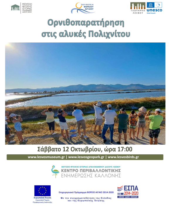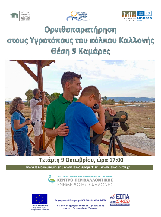 Το Μουσείο Φυσικής Ιστορίας Απολιθωμένου Δάσους Λέσβου / Κέντρο Περιβαλλοντικής Ενημέρωσης Καλλονής συνεχίζει τις φθινοπωρινές δράσεις ορνιθοπαρατήρησης και διοργανώνει νέες εξορμήσεις με σκοπό την γνωριμία των κατοίκων και των επισκεπτών του νησιού με τους φτερωτούς επισκέπτες της Λέσβου και την ευαισθητοποίησή τους.