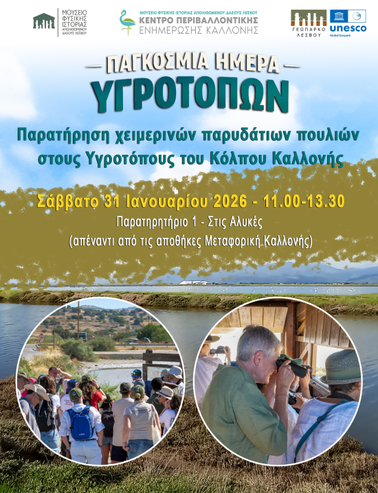 Τα στελέχη του Μουσείου Φυσικής Ιστορίας Απολιθωμένου Δάσους Λέσβου και του Κέντρου Περιβαλλοντικής Ενημέρωσης Καλλονής σας περιμένουν για την εκδήλωση ορνιθοπαρατήρησης που θα γίνει το Σάββατο 31 Ιανουαρίου 2026 στις 11.00-13.30! Η εκδήλωση θα πραγματοποιηθεί στο Παρατηρητήριο Νο 1 στη ΒΑ πλευρά της Αλυκής (απέναντι από τη Μεταφορική Καλλονής).