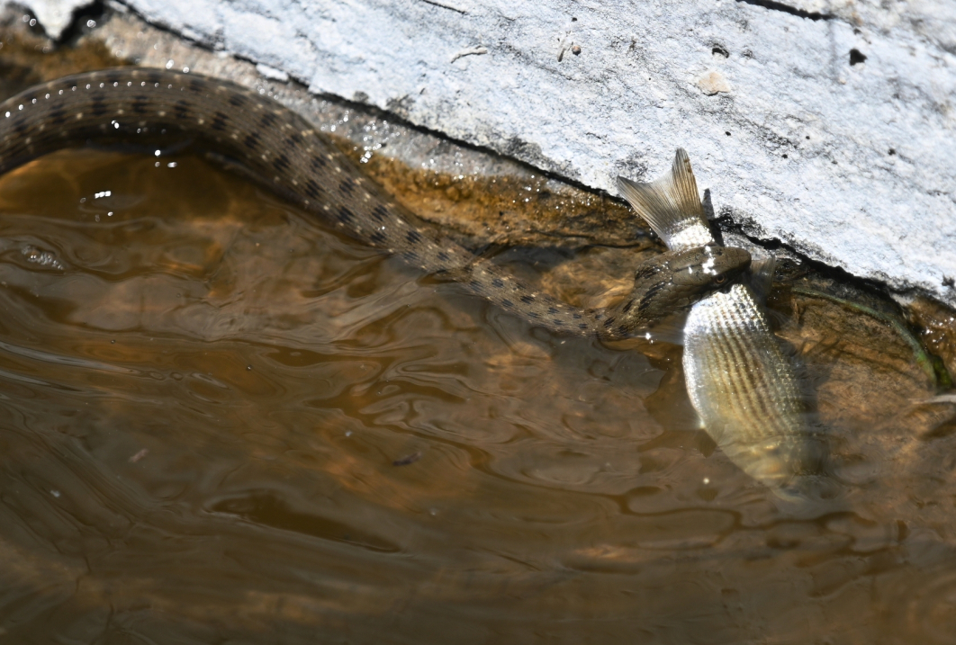 Εκτός από πουλιά είχαμε την ευκαιρία να παρατηρήσουμε και κάποια από τα ερπετά των υγροτόπων. Τις απειλούμενες Γραμμωτές Νεροχελώνες (Mauremys rivulata) που λιάζονταν για να ανεβάσουν τη θερμοκρασία σώματός τους και ένα Νερόφιδο (Natrix natrix) που προσπαθούσε να καταπιεί ένα μικρό ψάρι που είχε πιάσει. Τέλος, δεν μπορούσαμε παρά να παρατηρήσουμε και συζητήσουμε την πίεση που ασκεί ο άνθρωπος με τις επεμβάσεις του στους υγροτόπους.