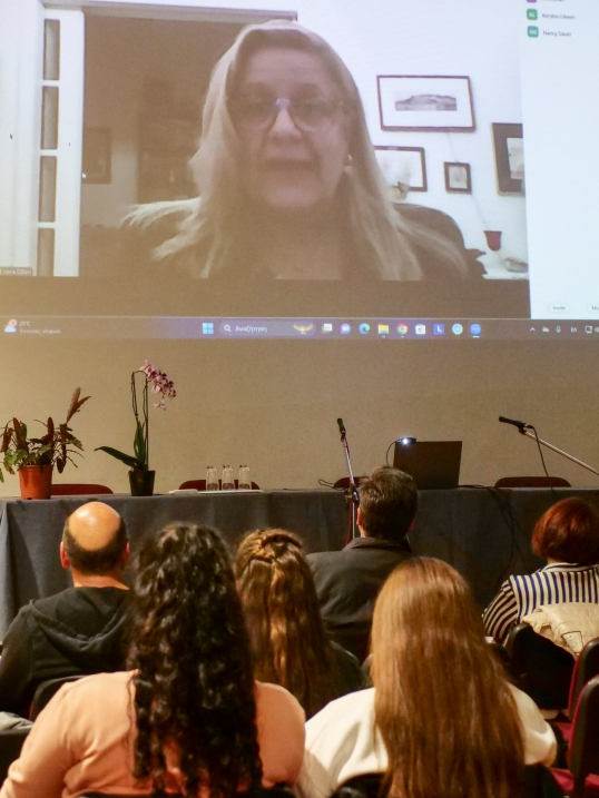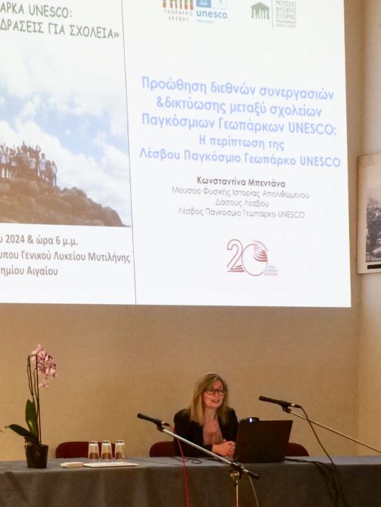 Ακολούθως η κα. Κωνσταντίνα Μπεντάνα, Προϊσταμένη του Τμήματος Εκπαιδευτικών Προγραμμάτων του Μουσείου Φυσικής Ιστορίας Απολιθωμένου Δάσους Λέσβου αναφέρθηκεσ τις διεθνείς εκπαιδευτικές δράσεις συνεργασίας που οργανώνει το Μουσείο στο Γεωπάρκο Λέσβου καθώς και το Διεθνή Διαγωνισμό κειμένου που οργανώνει το Παγκόσμιο Δίκτυο Γεωπάρκων για τους μαθητές των 213 Παγκόσμιων Γεωπάρκων UNESCO σε 48 χώρες από όλο τον κόσμο.