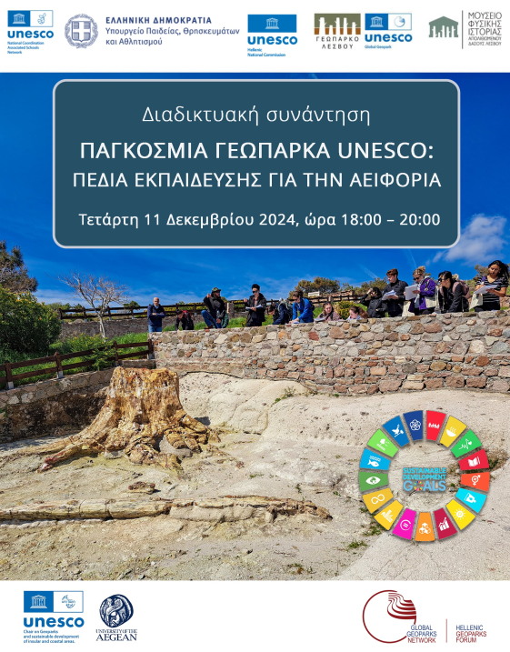 Το Υπουργείο Παιδείας και Θρησκευμάτων / Διεύθυνση Ευρωπαϊκών και Διεθνών Θεμάτων, την Ελληνική Εθνική Επιτροπή για την UNESCO, το Μουσείο Φυσικής Ιστορίας Απολιθωμένου Δάσους Λέσβου / Λέσβος Παγκόσμιο Γεωπάρκο UNESCO και την Έδρα UNESCO Πανεπιστημίου Αιγαίου για τα Γεωπάρκα και την βιώσιμη ανάπτυξη νησιωτικών και παράκτιων περιοχών οργανώνουν διαδικτυακή συνάντηση για εκπαιδευτικούς με θέμα «Παγκόσμια Γεωπάρκα UNESCO: Πεδία Εκπαίδευσης για την αειφορία».