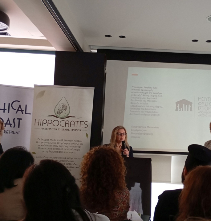 Εκ μέρους του Μουσείου Φυσικής Ιστορίας Απολιθωμένου Δάσους Λέσβου και του Γεωπάρκου Λέσβου, συμμετείχε στην ημερίδα, παρουσιάζοντας τις εκπαιδευτικές δράσεις που υλοποιούνται για μαθητές η κα. Κωνσταντίνα Μπεντάνα, Προϊσταμένη του Τμήματος Εκπαιδευτικών Προγραμμάτων. Η κα. Μπεντάνα κατά τη διάρκεια της ομιλίας της αναφέρθηκε στους λόγους που κάνουν τη Λέσβο-Παγκόσμιο Γεωπάρκο UNESCO ιδανικό προορισμό για εκπαιδευτικές επισκέψεις και δράσεις βιωματικής μάθησης. Το Γεωπάρκο Λέσβου και το Απολιθωμένο Δάσος, αποτελούν ‘υπαίθριες τάξεις’, όπου μαθητές και εκπαιδευτικοί μπορούν να γνωρίσουν τη γεωλογική, φυσική και πολιτιστική κληρονομιά της Λέσβου, τη γαστρονομία, την παράδοση, τις τέχνες αλλά και όλα τα στοιχεία εκείνα που απαρτίζουν το Γεωπάρκο Λέσβου και οδήγησαν στην αναγνώρισή του ως Παγκόσμιο Γεωπάρκο UNESCO.