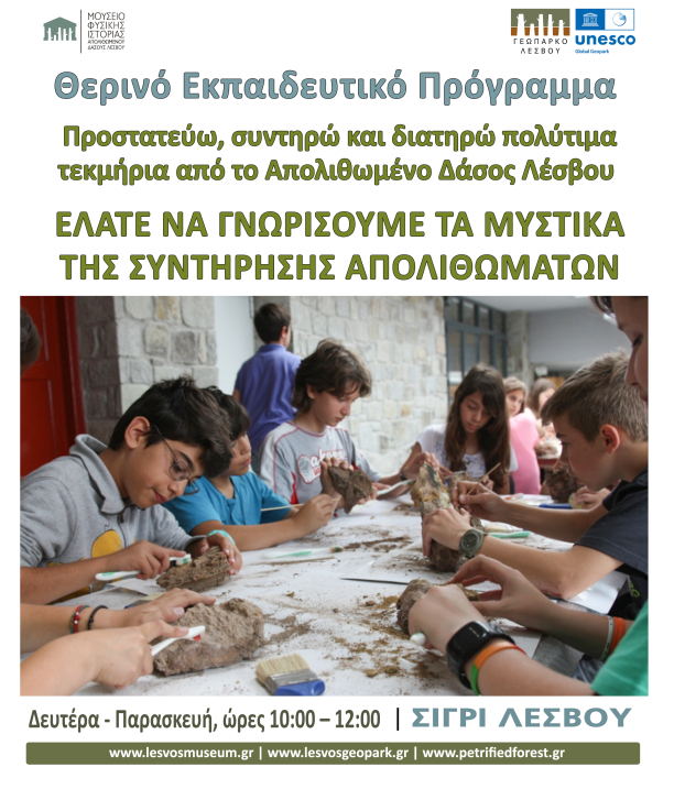 Ελάτε να γνωρίσουμε τα μυστικά της συντήρησης απολιθωμάτων! είναι προτροπή για τους μικρούς μας φίλους και ταυτόχρονα η πρόσκληση συμμετοχής στο θερινό εκπαιδευτικό πρόγραμμα Προστατεύω συντηρώ και διατηρώ πολύτιμα τεκμήρια από το Απολιθωμένο Δάσος Λέσβου του Μουσείου Φυσικής Ιστορίας Απολιθωμένου Δάσους Λέσβου.