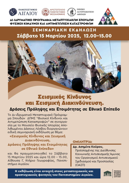 Το Δι-ιδρυματικό Μεταπτυχιακό Πρόγραμμα Σπουδών ΔΠΜΣ “Φυσικοί Κίνδυνοι και Αντιμετώπιση Καταστροφών” σε συνεργασία με το Μουσείο Φυσικής Ιστορίας Απολιθωμένου Δάσους Λέσβου διοργανώνουν ειδική σεμιναριακή εκδήλωση με θέμα: