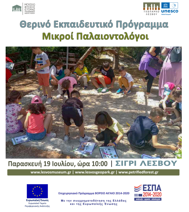 Το Μουσείο Φυσικής Ιστορίας Απολιθωμένου Δάσους Λέσβου καλεί όλους τους μικρούς του φίλους να ζήσουν μοναδικές καλοκαιρινές εμπειρίες συμμετέχοντας στο θερινό του εκπαιδευτικό πρόγραμμα «Μικροί Παλαιοντολόγοι», το οποίο θα υλοποιηθεί την Παρασκευή 19 Ιουλίου και ώρα 10:00 π.μ. στις εγκαταστάσεις του στο Σίγρι.